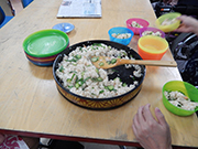 今年度から、料理プログラムボードを作って材料、調理手順を確認できるようにしました☆ キャベツ一玉買えばロールキャベツいっぱいできるんじゃない〜?